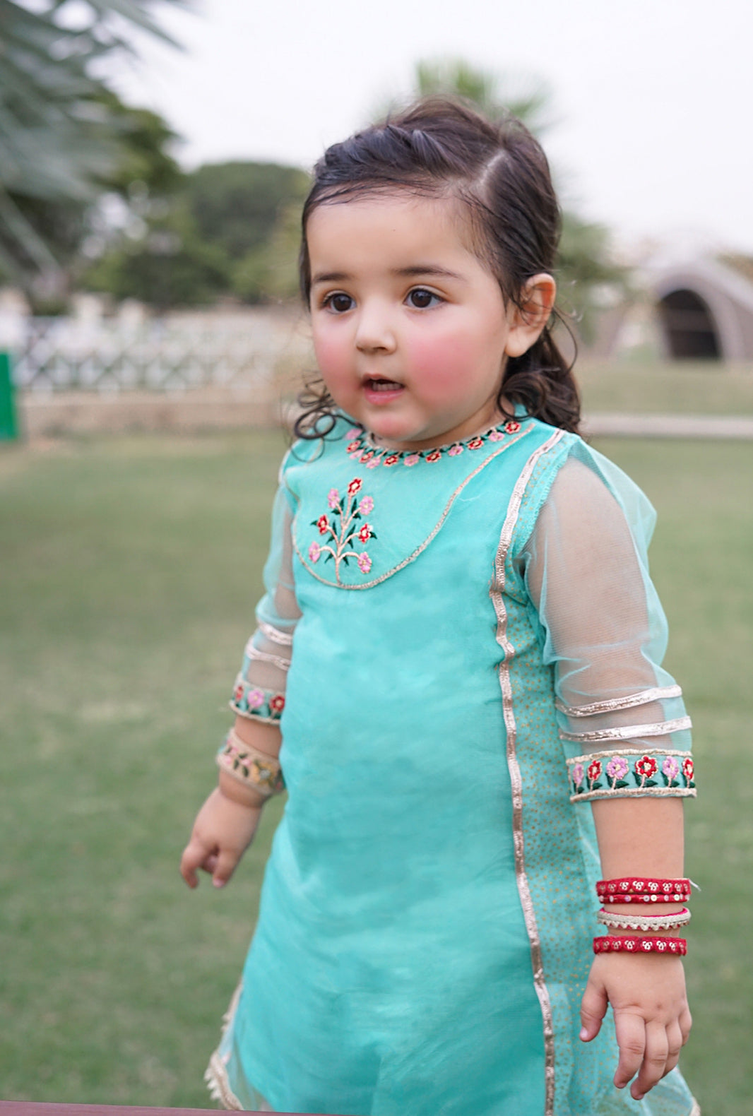 This beautiful ensemble is inspired by our heritage and history. Created with a stunning Turquoise gold speckled tulle fabric and stitched in panels along with a soft tulle fabric in the same color, the panels add a lovely silhouette and flare to the A-line shirt. The shirt features delicate floral embroidery on the front and sleeves done with silk threads and golden tilla. The entire shirt and dupatta are adorned with golden Gotta lace. The shirt is lined with cotton silk and comes with a gold brocade pair of pants and an embellished golden dupatta. Our Ferozi Anarkali suit is absolutely perfect for Eid, Weddings & formal events.