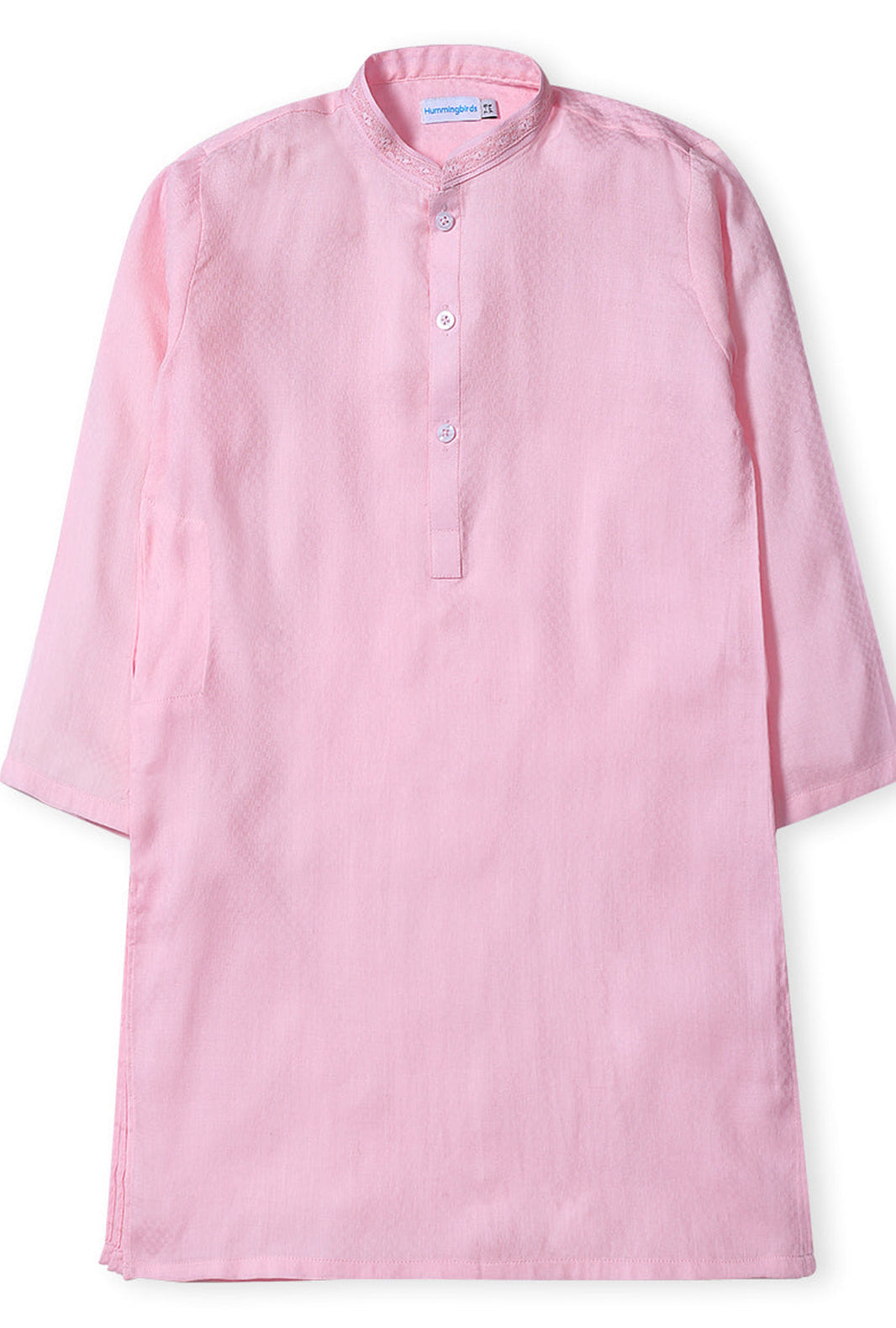 Inspired by the spring season, this kurta is as soothing as its name. The fresh and cool Pastel Pink color will add vibrance to your little one's Eastern wardrobe. Crafted with a embossed woven Jacquard lawn fabric, it features an self woven print and is accented with crocheted lace along the collar. Pair it with anyone of our stunning waistcoats to get the complete look!