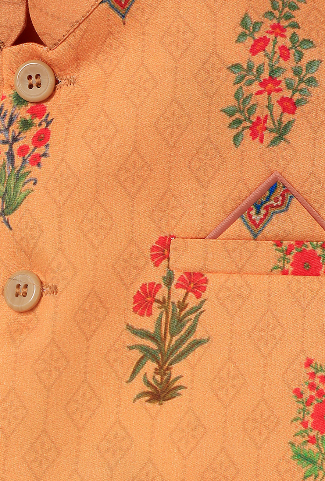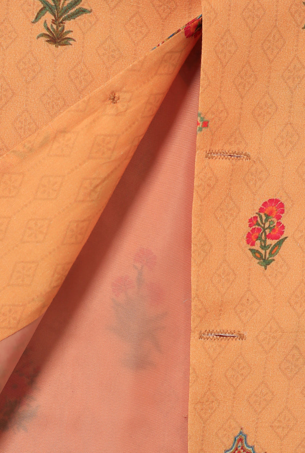 Imagine walking into a garden full of Peach blossoms! That's what inspired us to create this floral Peach-hued waistcoat, it's indeed a sight for sore eyes. Imagined in a soft and summery Cotton fabric, it features a garden full of Peach blossoms all over. Lined with fine pure silk, the wooden buttons add elegance to the whole look. Ideally, it can be paired with our coral reef kurta or any other color from our 2023 Eid Collection.