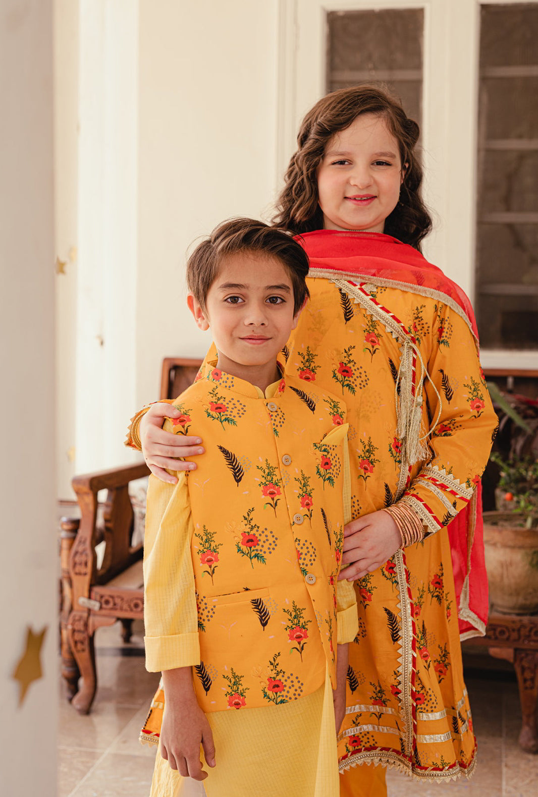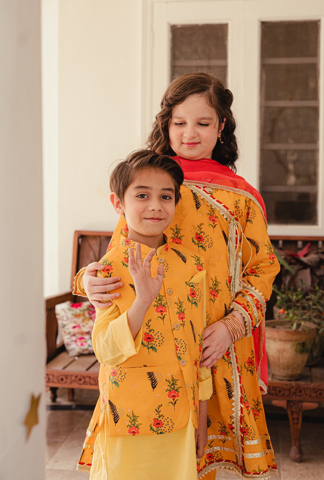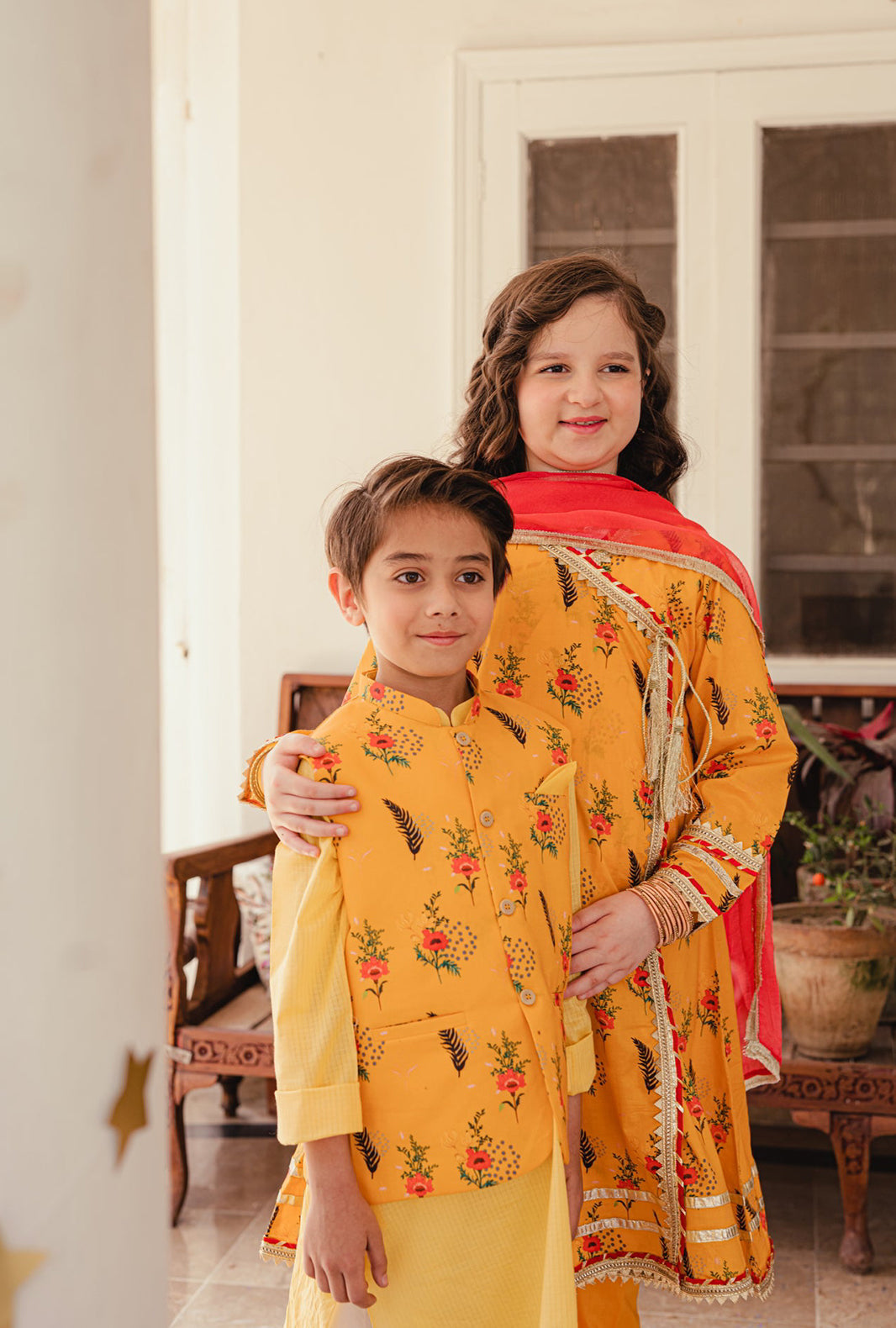 Inspired by the beautiful yellow Pukhraj stone from our sub-continent. This jewel coloured traditional Angrakha Suit is created with pure Cotton lawn that features pink poppy florets printed all over. Its an A line flowy Angrakha style that is accented with Gotta and traditional chatta Patti laces. The look is completed with a striking coral coloured dupatta finished with gold lace and yellow cotton pajama adorned with layers of lappa on the hem. Match her stunning outfit with her brothers this Eid!