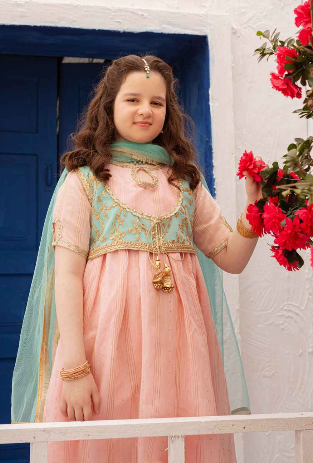 Fit for a Princess. What a delicious colour combination! Peshwaz suit being Hummingbirds signature style, this four-piece eye-catching ensemble is a must-have in any girls wardrobe.